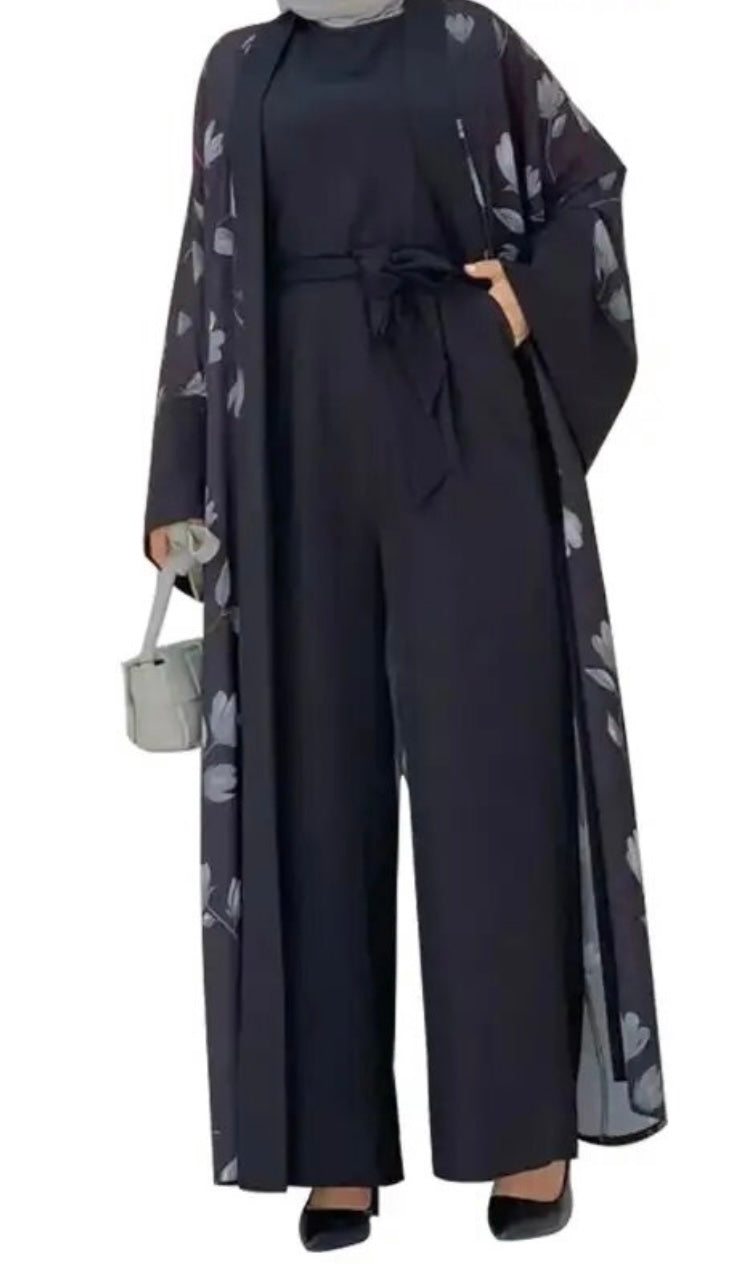 Looking for a stylish abaya that is modest enough to be worn to a religious function but fashionable enough to then be worn to a party afterwards? Well, we have the perfect outfit for you! Our gorgeous open abaya and jumpsuit two piece set.