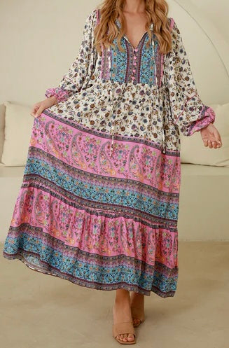 Cream, Pink and Blue Bohemian Floral Dress