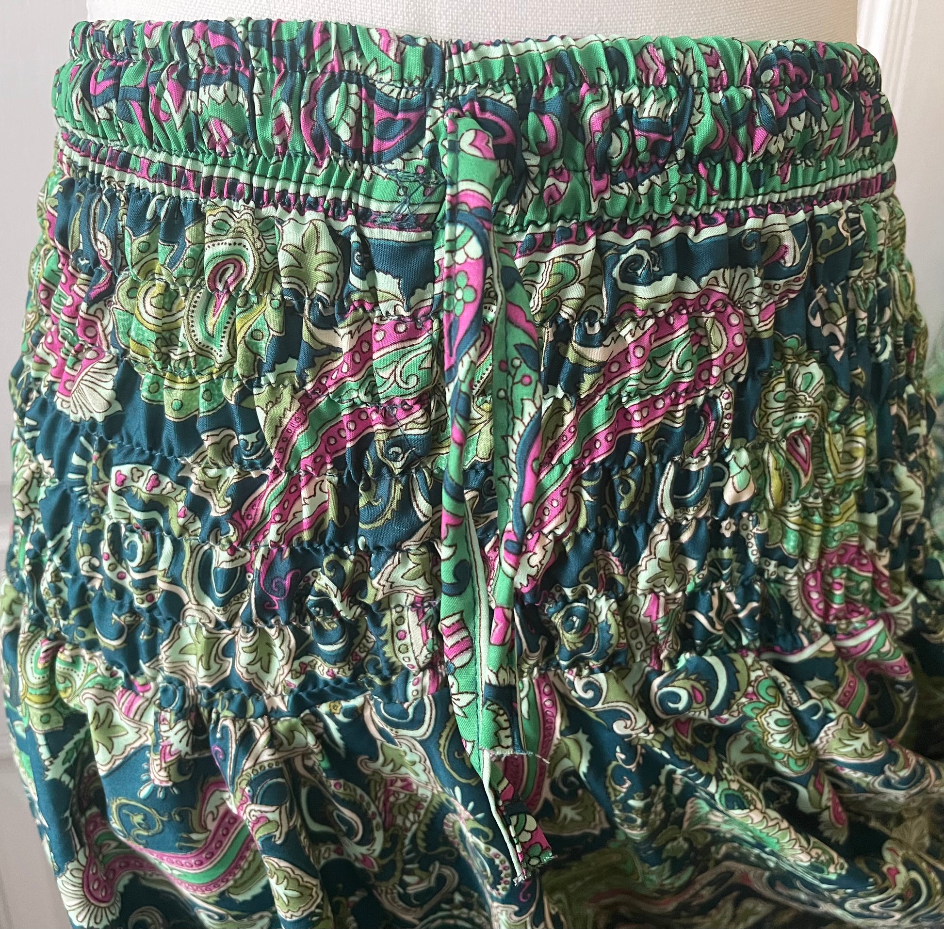 Our Hippy style clothes are made in Nepal. These garments are made using fair trade and slow fashion practices, thereby creating work and future employment opportunities for Nepalese people, without creating sweat-shop working conditions. This entire fair trade, slow fashion principle is entirely in line with the hippy style which came out of the 1960s-70s pop-culture and political movement of the same name. Hippy philosophies sought to recognise the influence of ethnic communities, celebrate historical and traditional folk arts, and create environmentally and socially sustainable employment opportunities via local cooperatives and community interests. These pants are made utilising a modern implementation of these philosophies. It celebrates the use of natural (thus more environmentally sustainable) products such as silk, and the use of these products in garments that emphasise earthy colours and folk art - two elements critical to the hippy aesthetic.